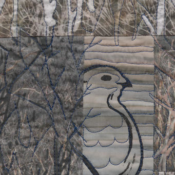 Ptarmigan are adapted for survival by feathers changing color from brown in the summer to white in the winter, and back again. The length of daylight is the main determinant of this seasonal molt. As our climate changes, snow melts earlier each year, leaving white ptarmigan visible in the midst of their browning world. As climate changes bringing warmer temperatures, vegetation is able to grow at increasingly higher elevation. Brushy undergrowth and spruce trees invade areas previously inhabited by ptarmigan. Many of the fabrics in this piece are hand-dyed, silkscreened, and/or designed by me. I use drawings and textures, some photographic, which I manipulate in Photoshop, and have commercially printed. The white-tailed ptarmigan images in this piece have been silk-screened onto fabrics. Birds at the top of the piece are surrounded by typical vegetation and snow patterns found in their environment. Outlines toward the bottom represent ghost images of birds surrounded by vegetation species which now inhabit areas where they used to live.